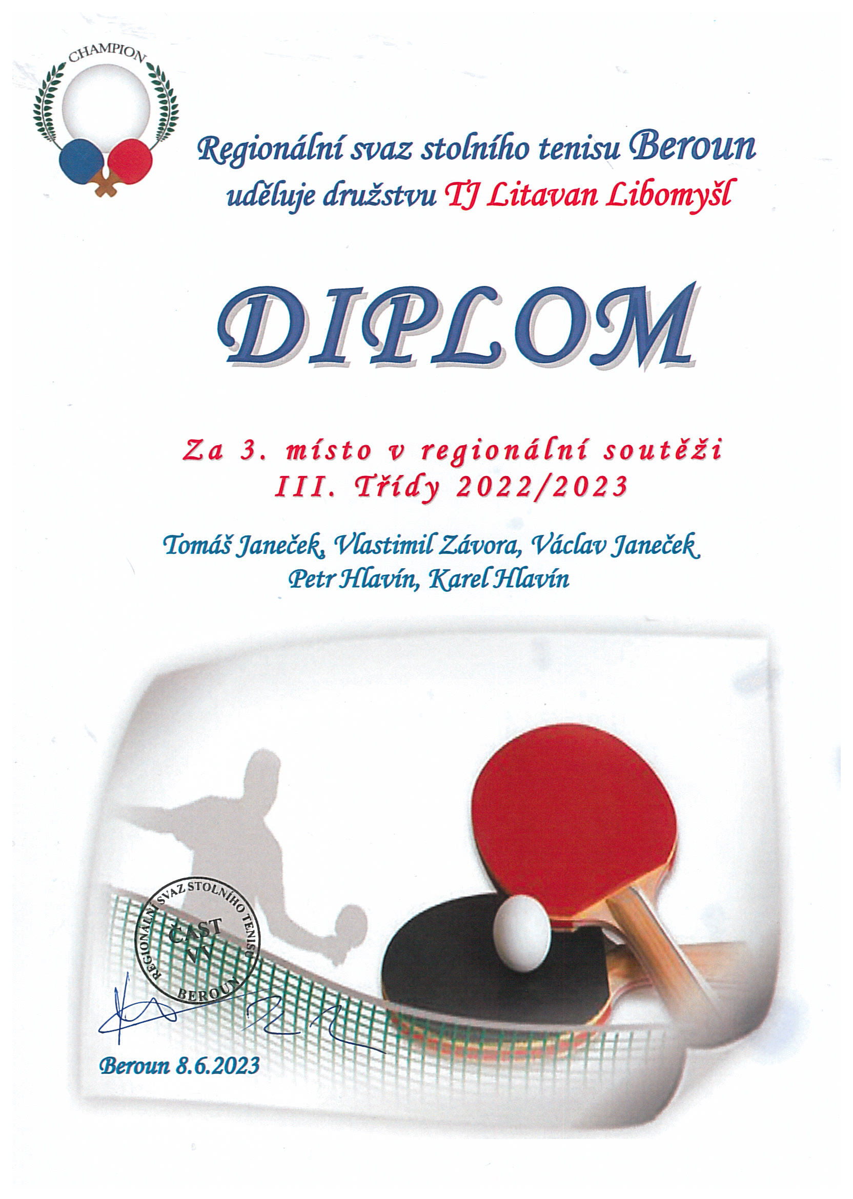 Tým stolního tenisu v sezóně 2022/2023 obsadil 3. místo